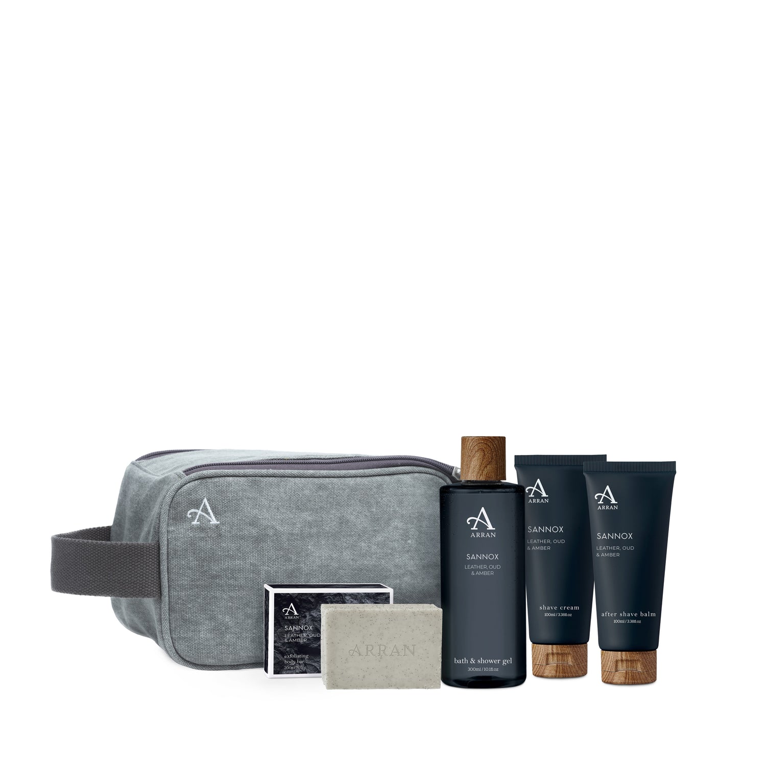Discover Sannox, Scotland’s first, premium men’s fragrance collection. Crafted with Scottish ingredients native to the Isle of Arran, and blended with unfiltered, mineral-rich local water. Wherever your adventure takes you, our Sannox Mens Wash Bag is perfect for carrying all your ARRAN essentials along the way. Made from durable cotton canvas with a water-resistant inner, this expertly crafted Mens Wash Bag contains a full-sized Bath & Shower Gel, After Shave Balm, Shave Cream and Soap in our premium Sannox fragrance. Captivate your sense and shop the Sannox range here. Key points Cleansing formulation Contains pro-vitamin B5 Promotes enhanced skin condition Scottish-derived sweet gale extract which is native to Glen Sannox About the range The dark, rugged hills of Glen Sannox forge a breath-taking backdrop to the peaceful village below. Robust granite casts jagged shadows on the surrounding hills, as the sun rises to awake the sleeping warrior. A rich sensual leather fragrance fused with amber and precious oud, harmonised with pink pepper and saffron. Product size 300ml Bath & Shower Gel, 200g Exfoliating Soap Bar, 100ml Shave Cream, 100ml Post Shave Balm. Directions for use Step into the shower and immerse yourself with the scents of Leather, Amber & Oud. Cleanse and moisturise your skin with the gentle properties of our new Sannox Bath & Shower Gel. Cleanse and nourish hands with the travel-sized Soap. For a streamlined shave, m assage the Shave Cream into wet skin and shave with a clean razor. Following shaving, rinse skin thoroughly and pat dry. Follow with Sannox After Shave Balm.