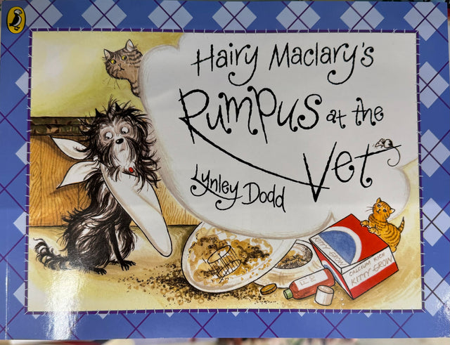 Hairy Maclary is waiting to see the vet with lots of other pets. Then something happens to turn the waiting room into a kerfuffling scramble of paws, a tangle of bodies and a jumble of jaws ...what can be the matter?