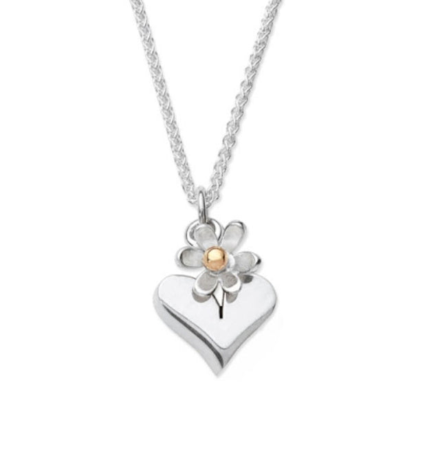 A delicate sterling silver heart and flower necklace from Linda Macdonald Jewellery. Designed and made in Scotland and inspired by nature and romance, this necklace combines a solid silver heart and a silver daisy charm with 9ct gold centre.