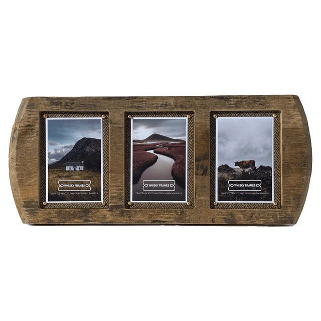 The frame is made from the barrel lids or "heads". The frame holds three 4x6-inch pictures. Although each frame is slightly different they are near 75cm x25cm in outer dimensions.